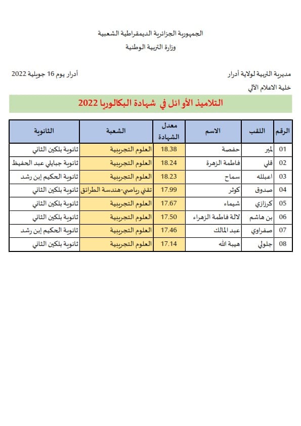 أدرار تحقق نسبة نجاح تفوق 52 بالمائة ونتائج نوعية ونتائج نوعية مقدرة 498 في باكلوريا هذه السنة